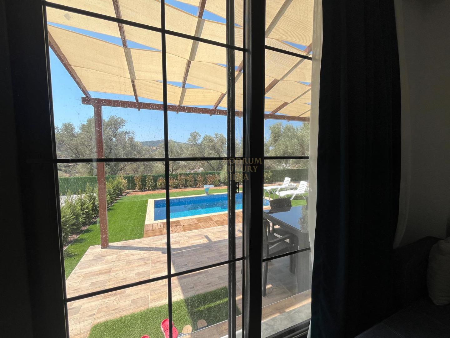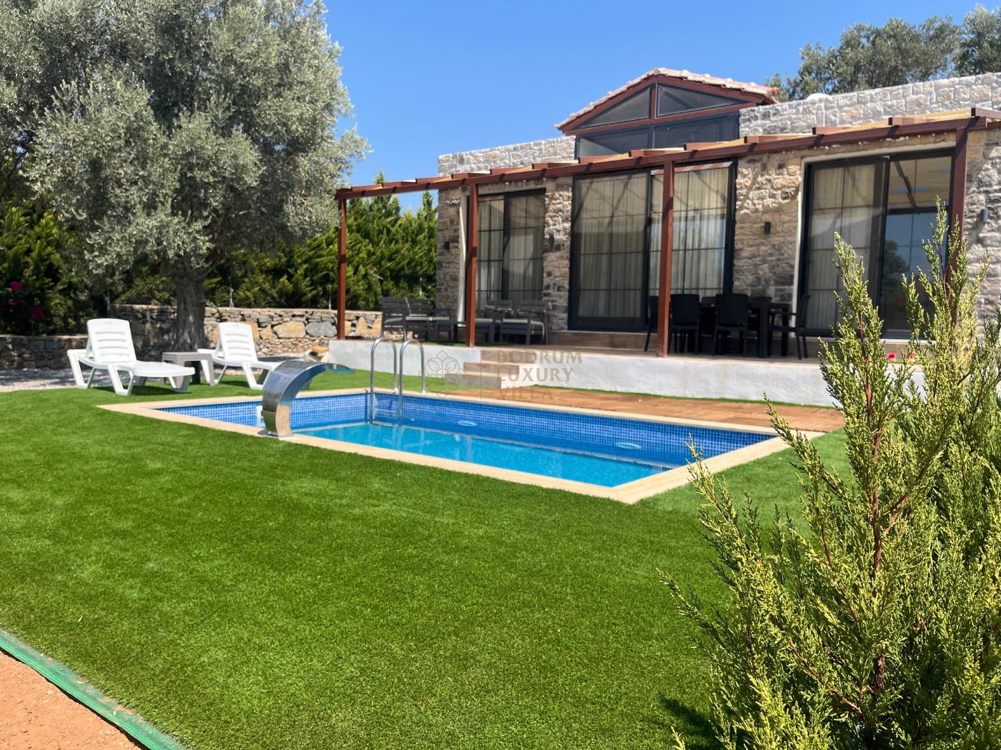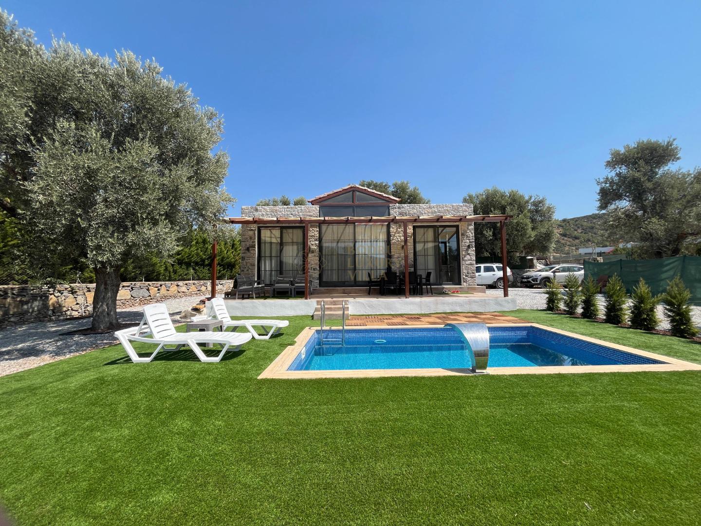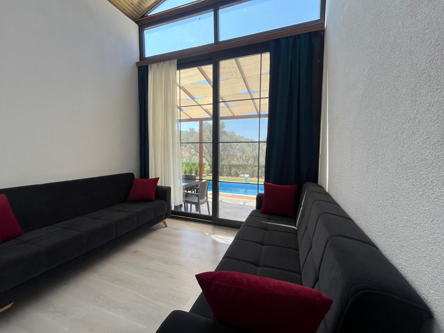 Our sheltered detached villa, located in the Yalıçiftlik neighborhood, 20 km from Bodrum center, has a small open kitchen, living room, two bedrooms and a bathroom. It has a capacity of 4 people with a double bed and 2 sofas in the bedrooms. It is an ideal option for honeymoon couples and nuclear families with its sheltered pool area.