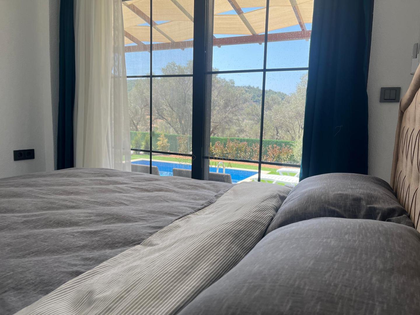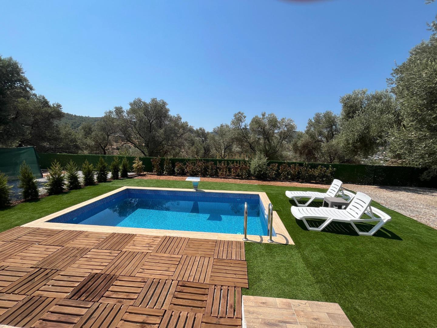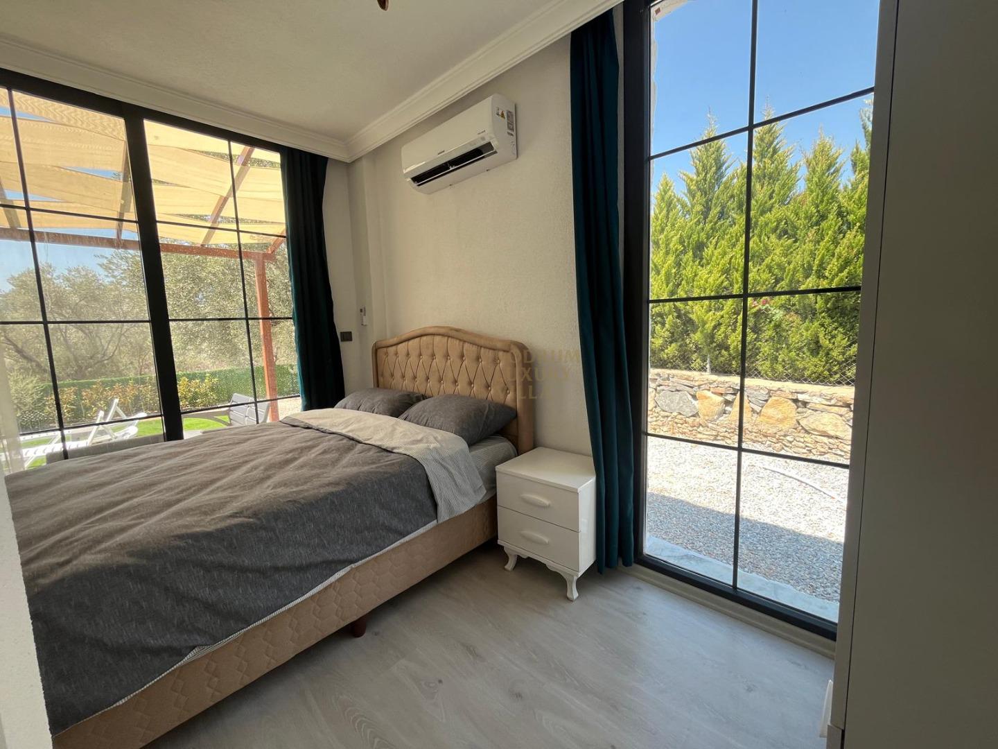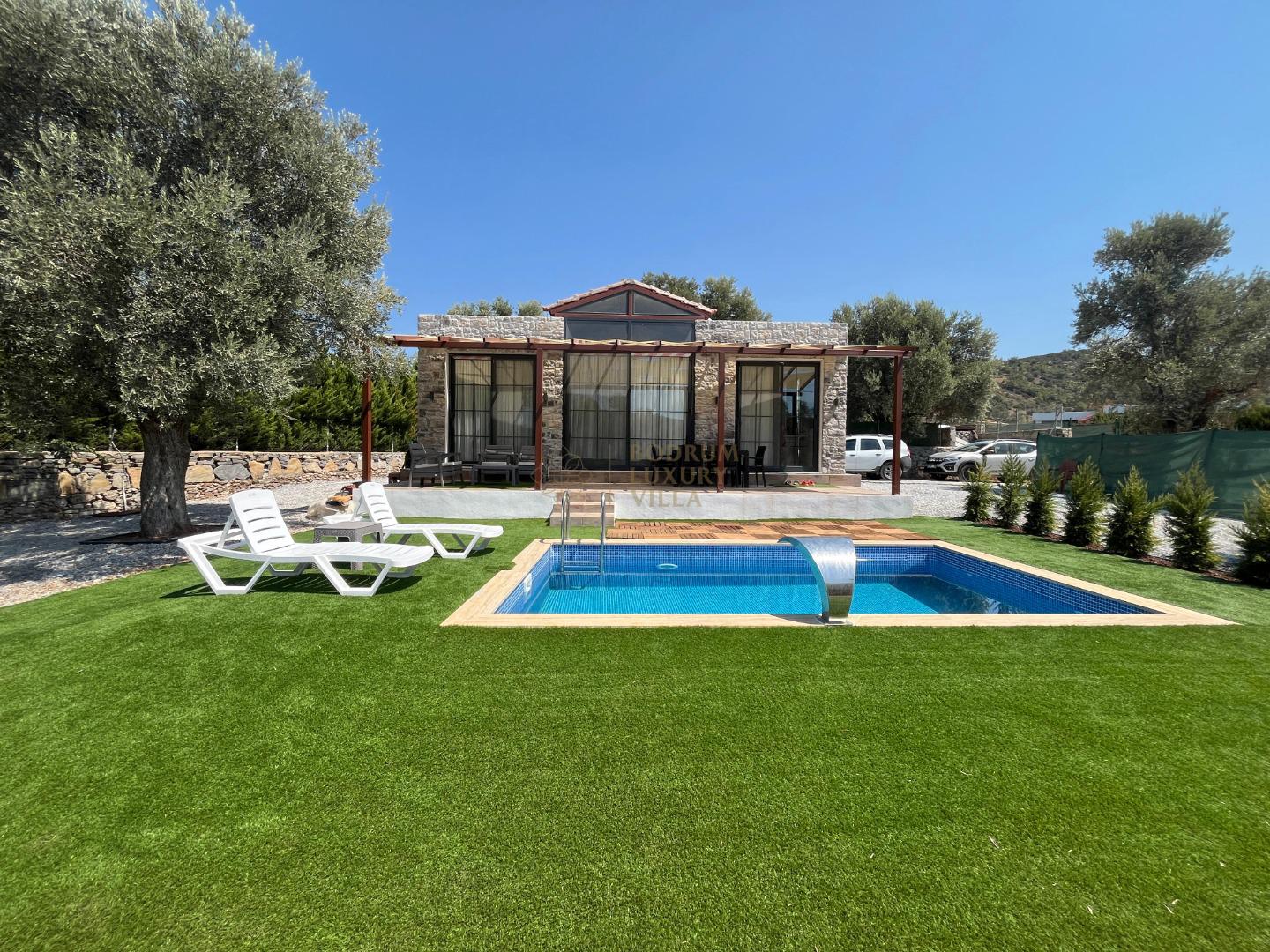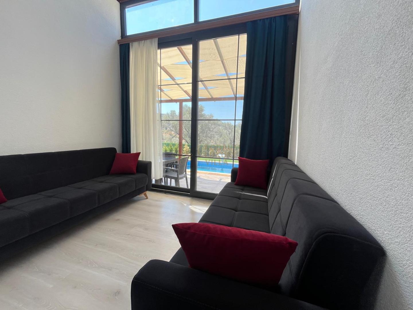 Our sheltered detached villa, located in the Yalıçiftlik neighborhood, 20 km from Bodrum center, has a small open kitchen, living room, two bedrooms and a bathroom. It has a capacity of 4 people with a double bed and 2 sofas in the bedrooms. It is an ideal option for honeymoon couples and nuclear families with its sheltered pool area.