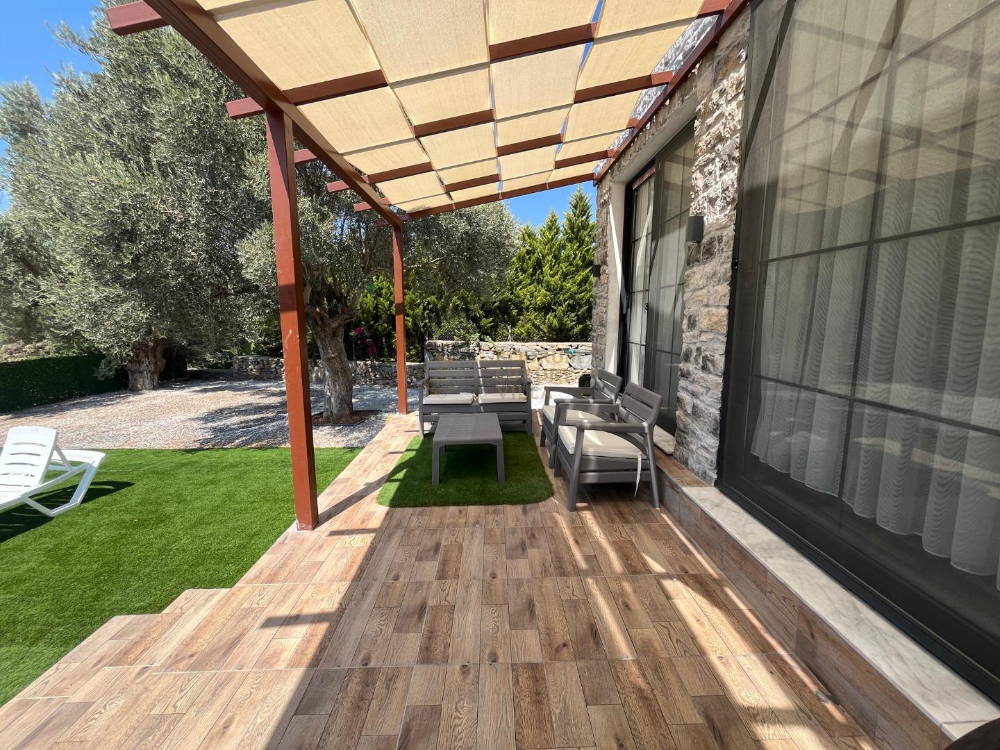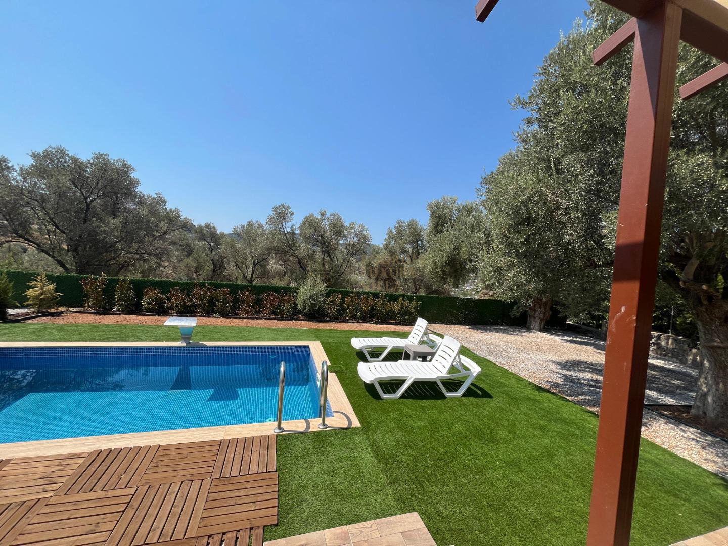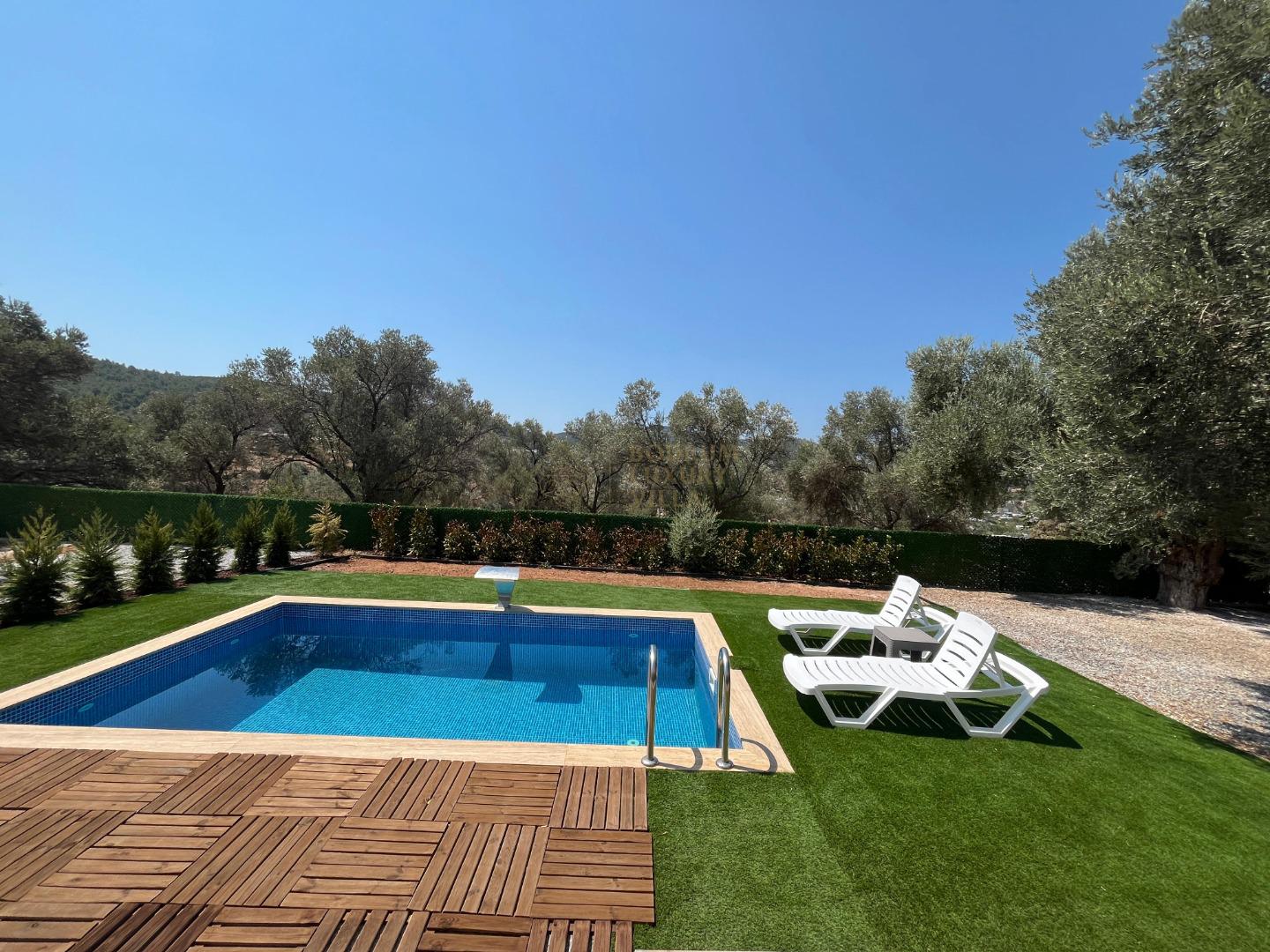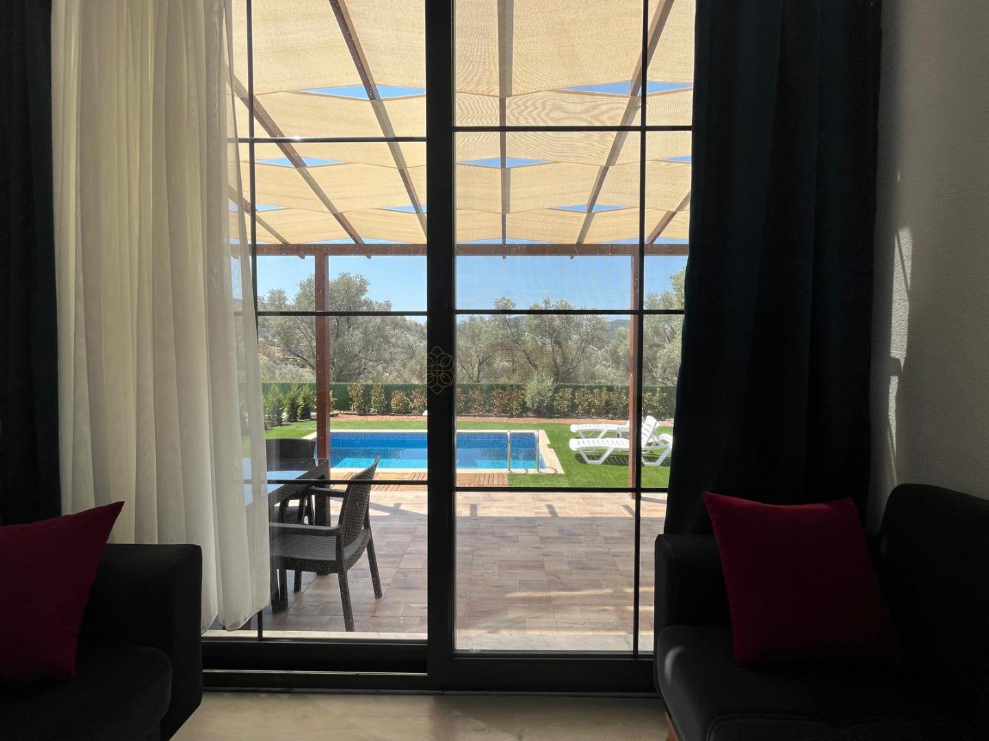 Our sheltered detached villa, located in the Yalıçiftlik neighborhood, 20 km from Bodrum center, has a small open kitchen, living room, two bedrooms and a bathroom. It has a capacity of 4 people with a double bed and 2 sofas in the bedrooms. It is an ideal option for honeymoon couples and nuclear families with its sheltered pool area.