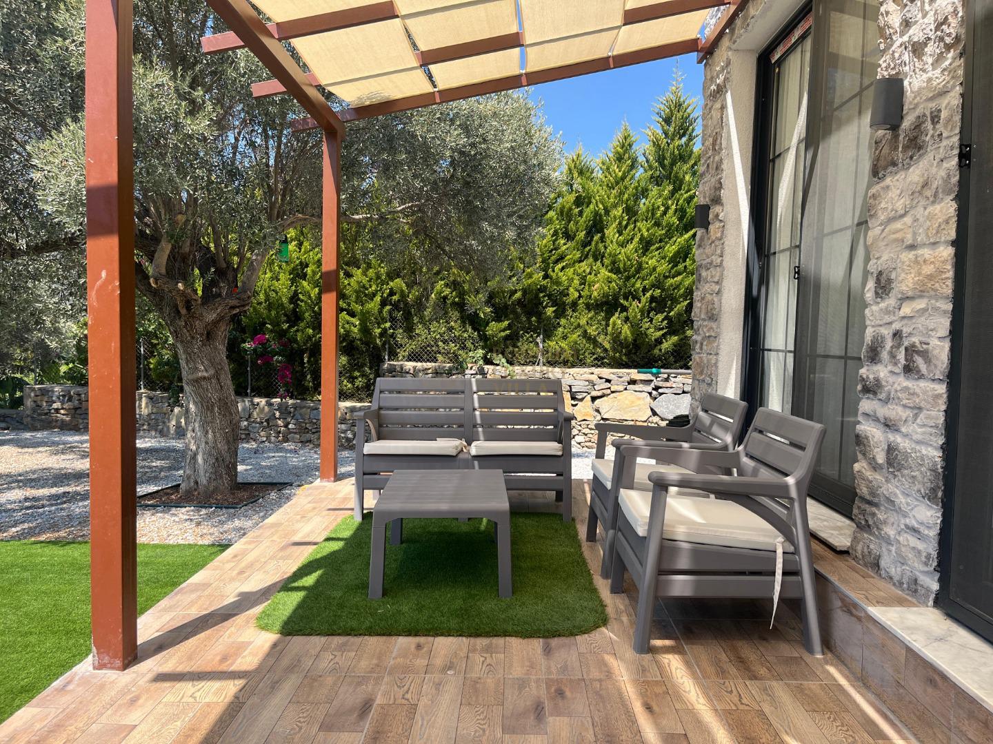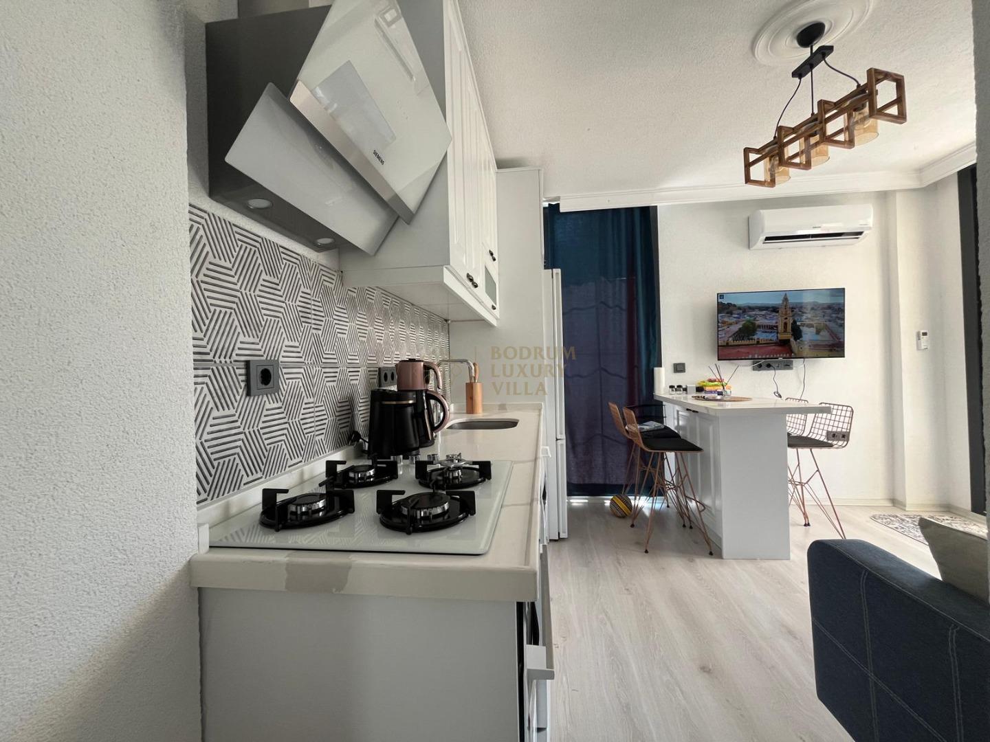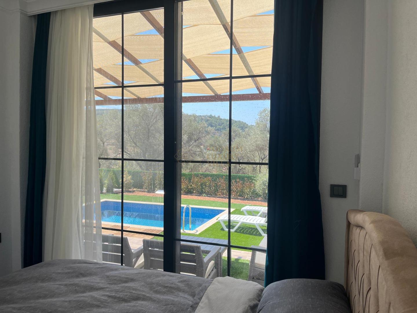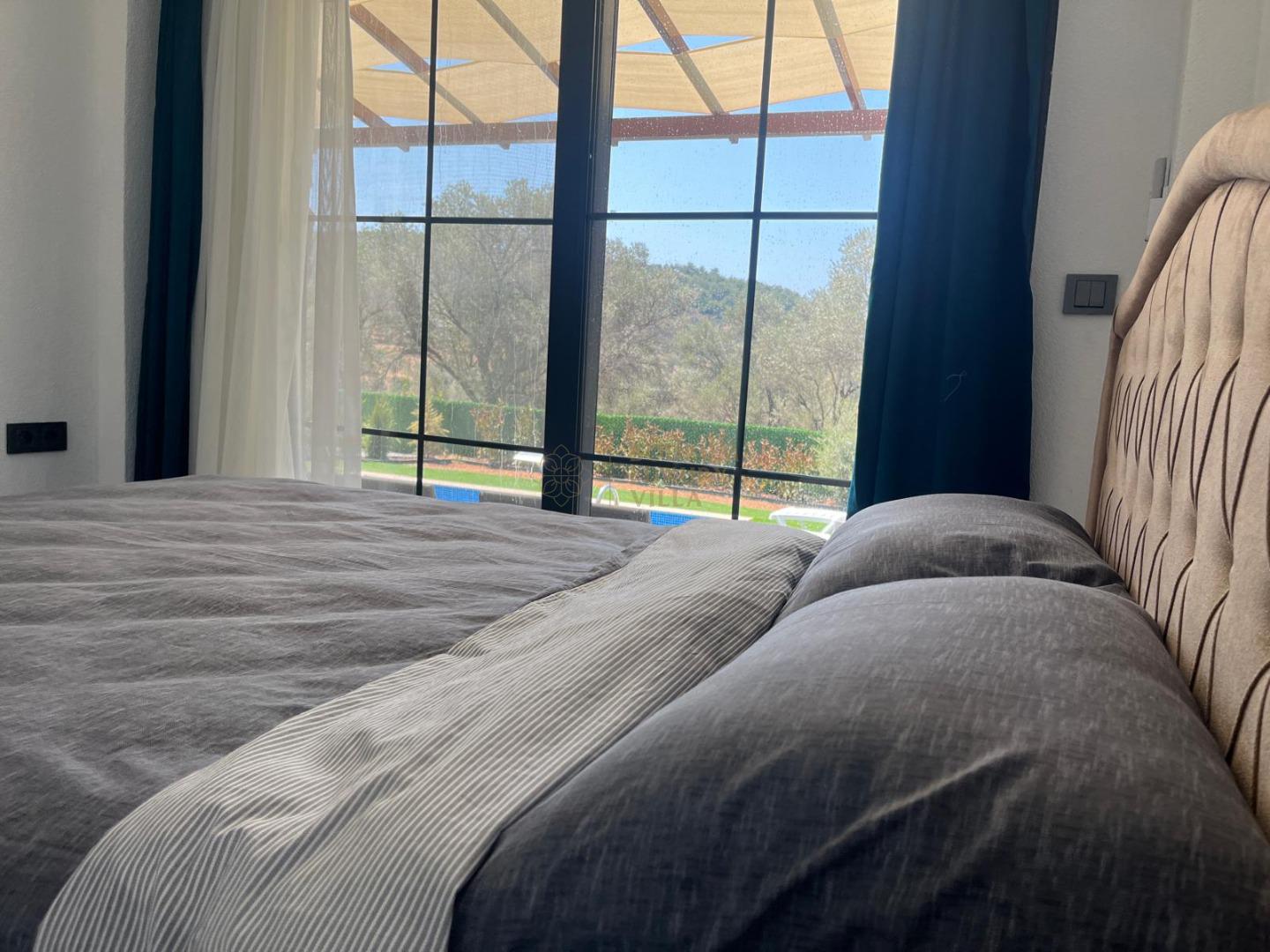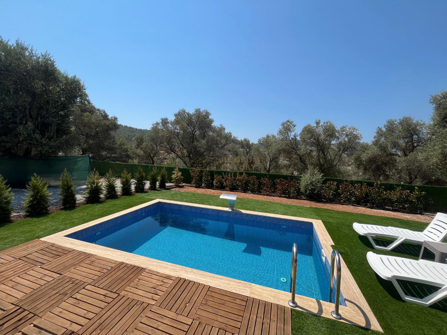 Our sheltered detached villa, located in the Yalıçiftlik neighborhood, 20 km from Bodrum center, has a small open kitchen, living room, two bedrooms and a bathroom. It has a capacity of 4 people with a double bed and 2 sofas in the bedrooms. It is an ideal option for honeymoon couples and nuclear families with its sheltered pool area.