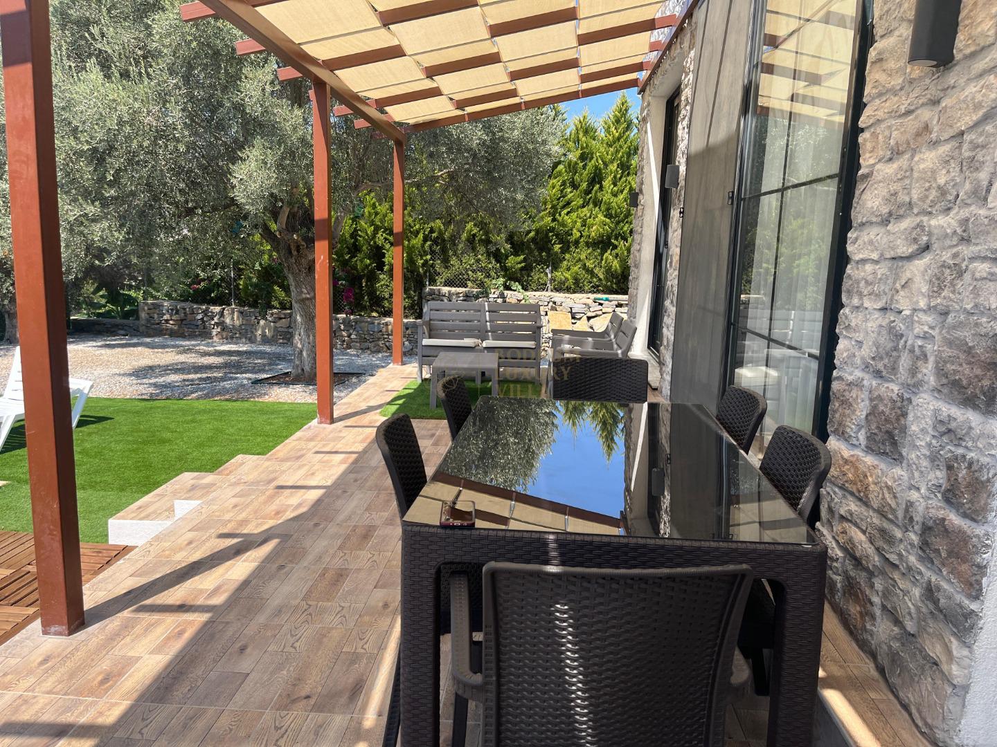 There is a 5m x 3m pool, a seating area and a dining table for 4 in the garden of our villa. It is a 10-minute drive to the nearest beach.